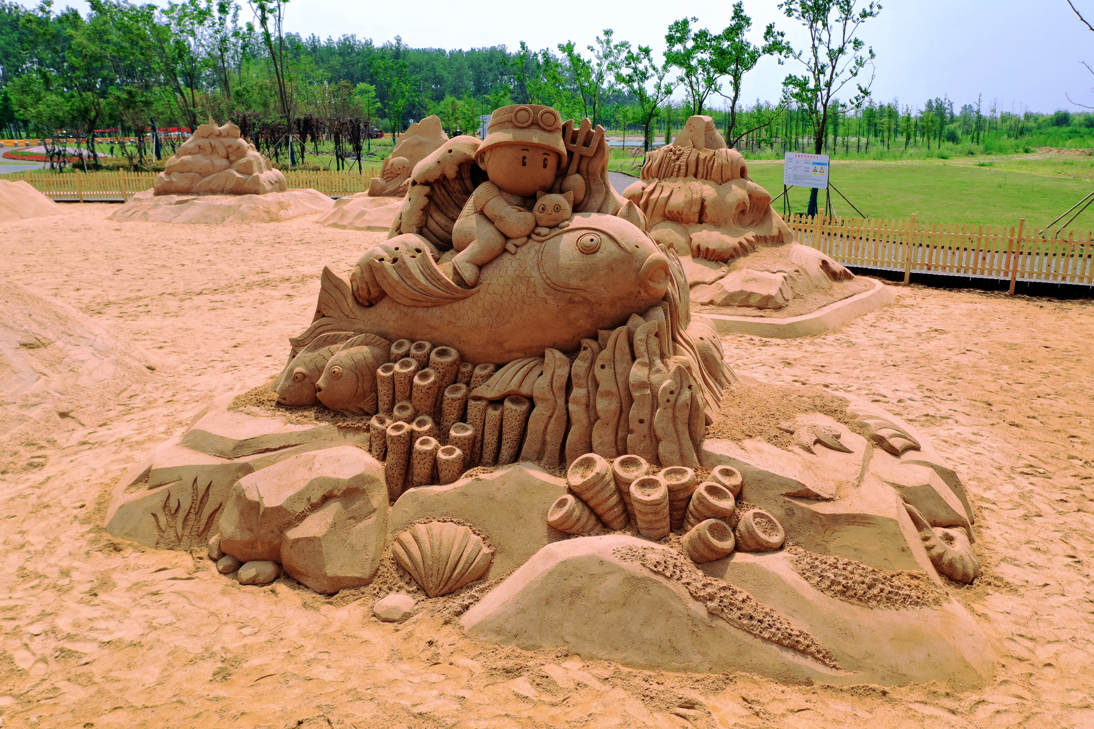 圍繞“沙”元素,“趣味沙世界”主題區(qū)以沙雕展示為主,七大主題的特色沙雕環(huán)繞排列,主沙雕《日月征程》展示了庫(kù)區(qū)群眾滄桑六十余載對(duì)水庫(kù)一刻不停的建設(shè)和守護(hù),《海陵湖的傳說》、《神往之地》、《漁舟芭蕾》、《知魚之樂》、《小貓釣魚》、《連年有魚》等主題將石梁河水庫(kù)方方面面的文化民俗精華盡數(shù)呈現(xiàn);“迷你親子水世界”主題區(qū),利用原有灘地的凹地,以生態(tài)塘+淺水沙灘的形式設(shè)計(jì)了一處可觀、可玩的親子互動(dòng)沙灘區(qū);“房車營(yíng)地”配有可租借帳篷、小木屋、運(yùn)動(dòng)游樂設(shè)備等露營(yíng)設(shè)施;“星空露營(yíng)基地”設(shè)置在杉樹林中,三面環(huán)水,與海陵湖秀麗的湖光相互映襯?!霸铝翞场睘椤包S金沙灘”的主沙灘區(qū),因其月牙的造型而得名,是欣賞海陵湖風(fēng)光的最佳區(qū)域。